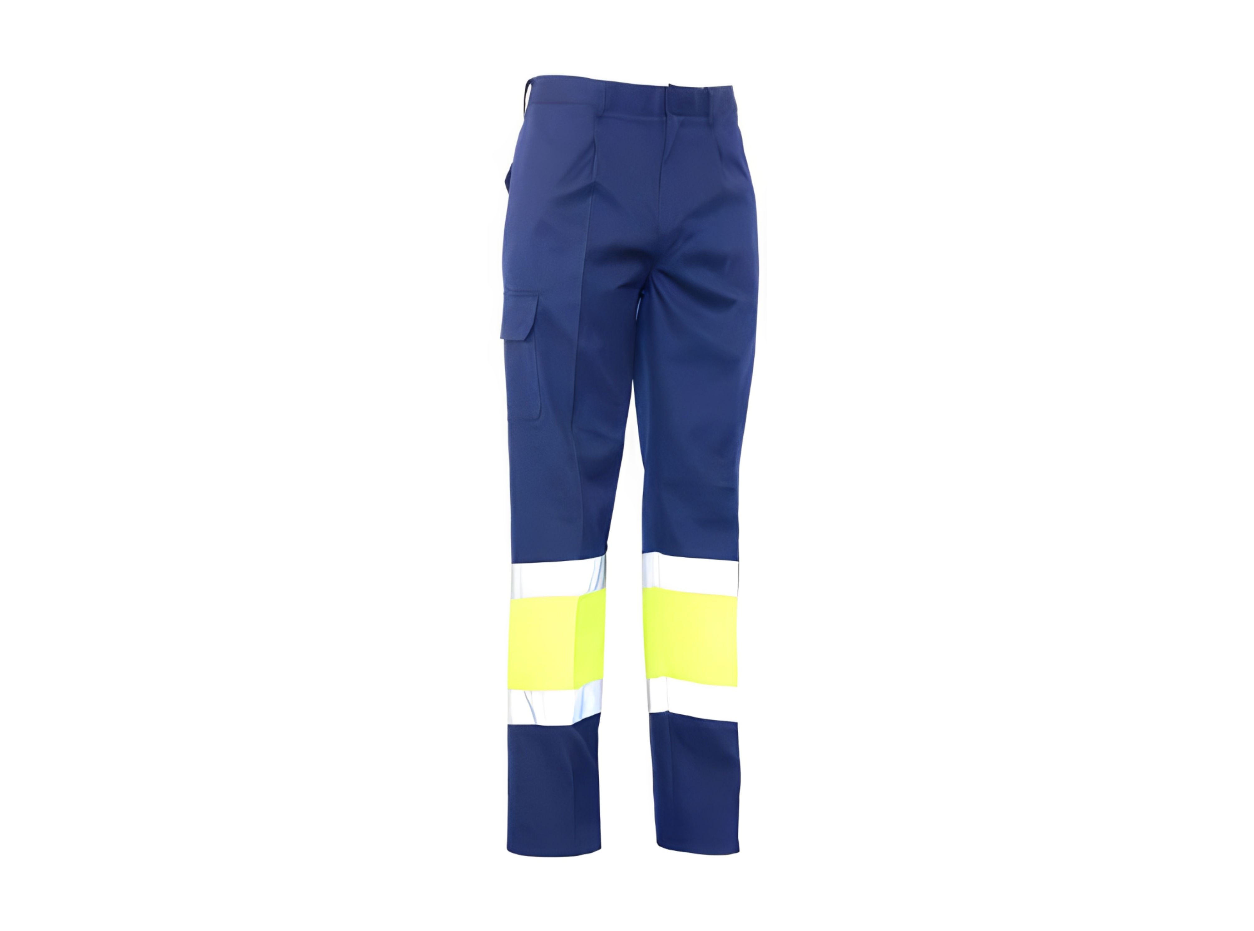Trousers 1/2 elastic waist at back, 2 front pockets in seam, 1 patch pocket with Velcro flap on right leg, 1 back poket with with Velcro flap. Clip button hidden in waistband. Lining in the same fabric, 2 fire-proof reflective stripes.