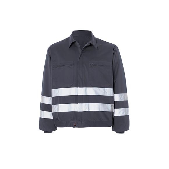 Cazadora cremallera central sopatada, 2 bolsillos de parche con tapeta y cremallera, puños elásticos, pinzas espalda en cinturilla y gomas. 2 bandas reflectantes en torso y mangas.