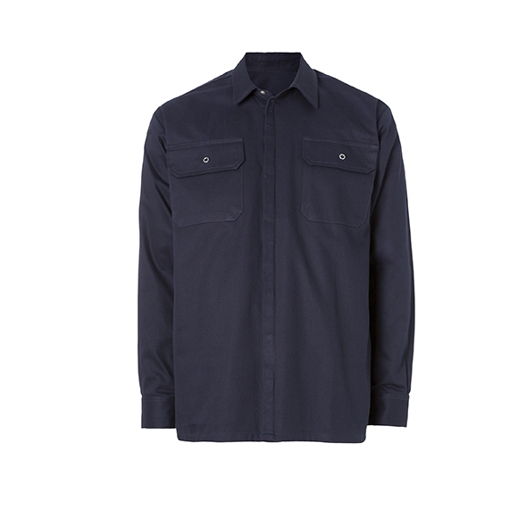 Long-sleeved shirt with covered clip button closing, 2 chest pockets with clip button, clip button cuffs, back yoke.