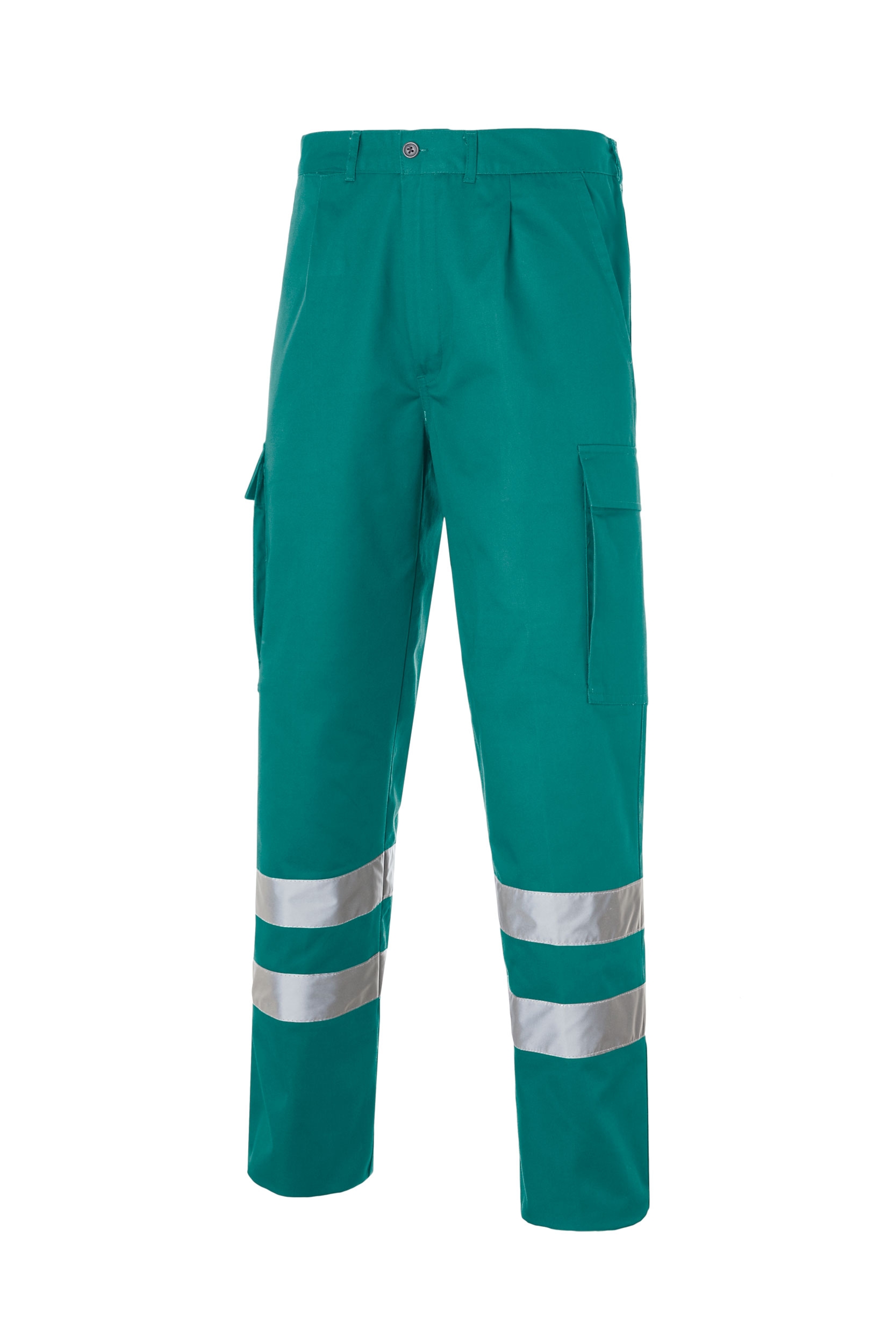 Trousers 1/2 elastic waist at back, 2 front slant pockets, watch pocket, 1 back patch pocket with clip button, 2 side bellow patch pocket with Velcro flap on each leg. Lining in same fabric. 2 reflective stripes.