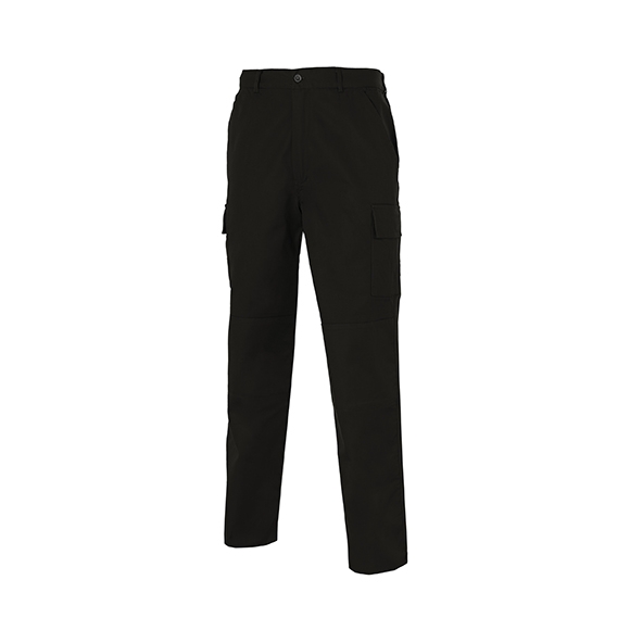 Trousers with elastic waist at side, 2 front slant pockets, watch pocket, 1 back patch pocket with flap and clip button, 2 side bellow patch pocket with Velcro flap on each leg. Lining in the same fabric. Reinforcement in seat and knees.