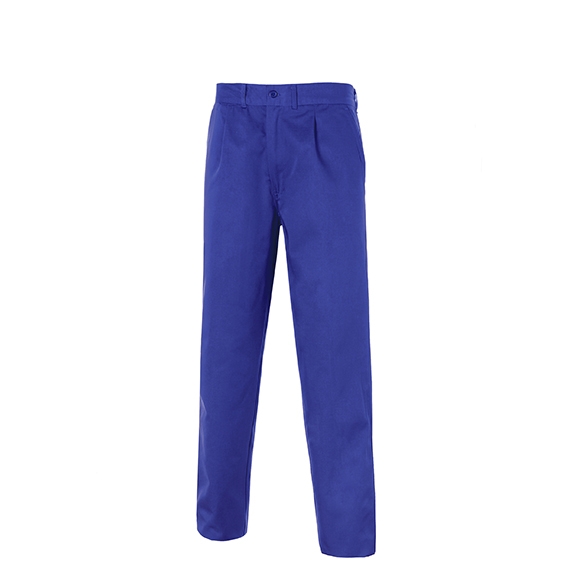 Trousers 1/2 elastic waist at back, 2 front slant pockets, watch pocket, 1 back slit pocket, 1 side carpenter pocket.