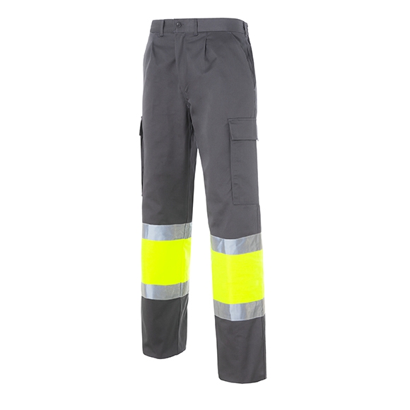 Pantalón multibolsillos bicolor 1/2 cintura elástica, 2 bolsillos delanteros inclinados, relojera, 1 bolsillo trasero de parche con clip, 2 bolsillos laterales de parche con fuelle, tapeta y velcro en ambas piernas. Forrería mismo tejido. 2 bandas reflectantes.