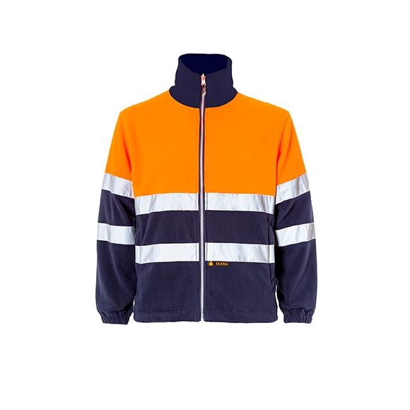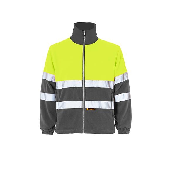 Chaqueta polar bicolor clase II cremallera central, 2 bolsillos inferiores cortados con cremallera, ceñidor en cintura, puños elásticos. 2 bandas reflectantes en torso y mangas.