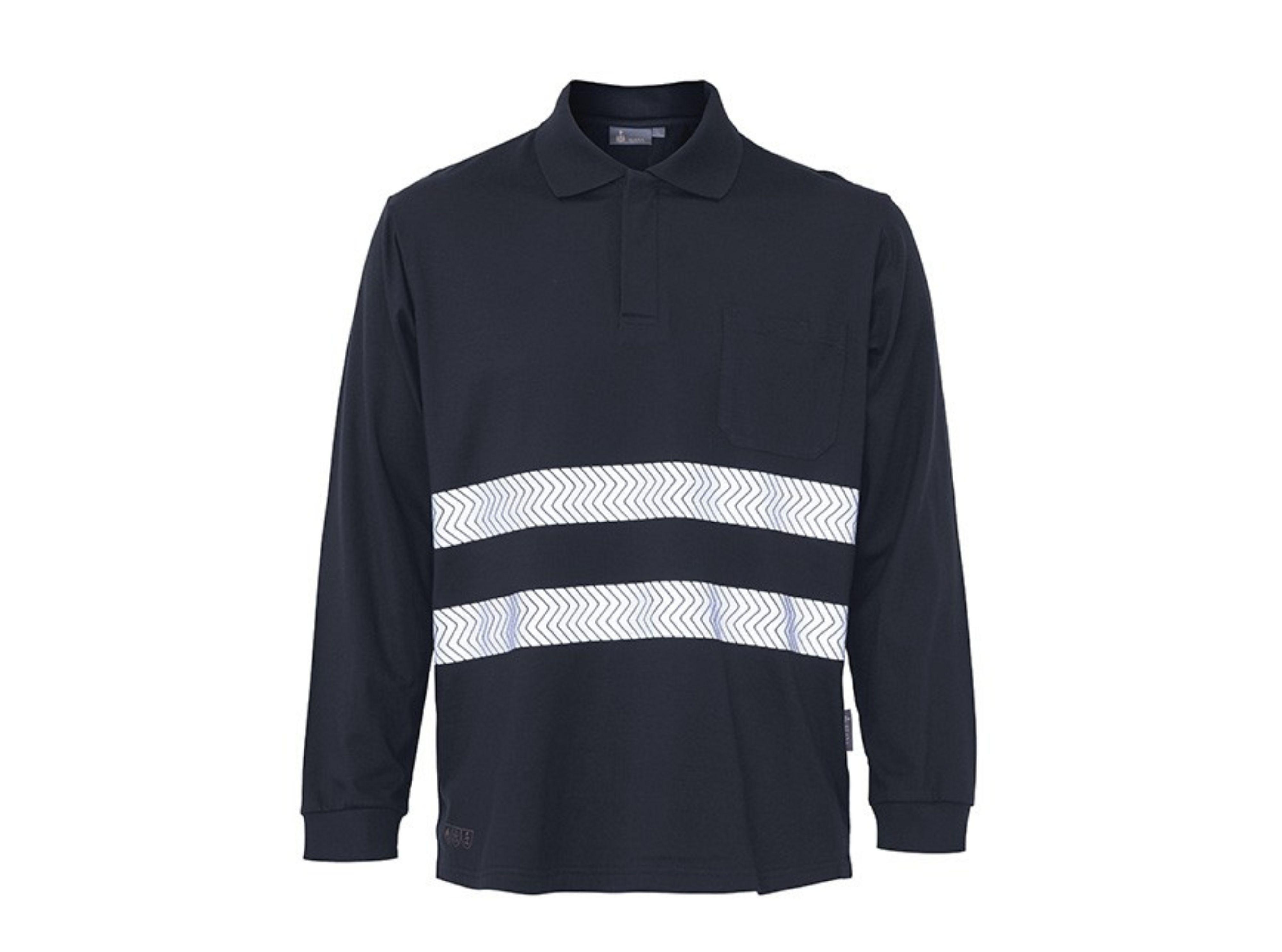 Polo manga larga punto liso ignífuga- Atex. 1 bolsillo con velcro en pecho. Puños elásticos. 2 bandas reflectantes termoselladas discontinuas ignífugas en torso