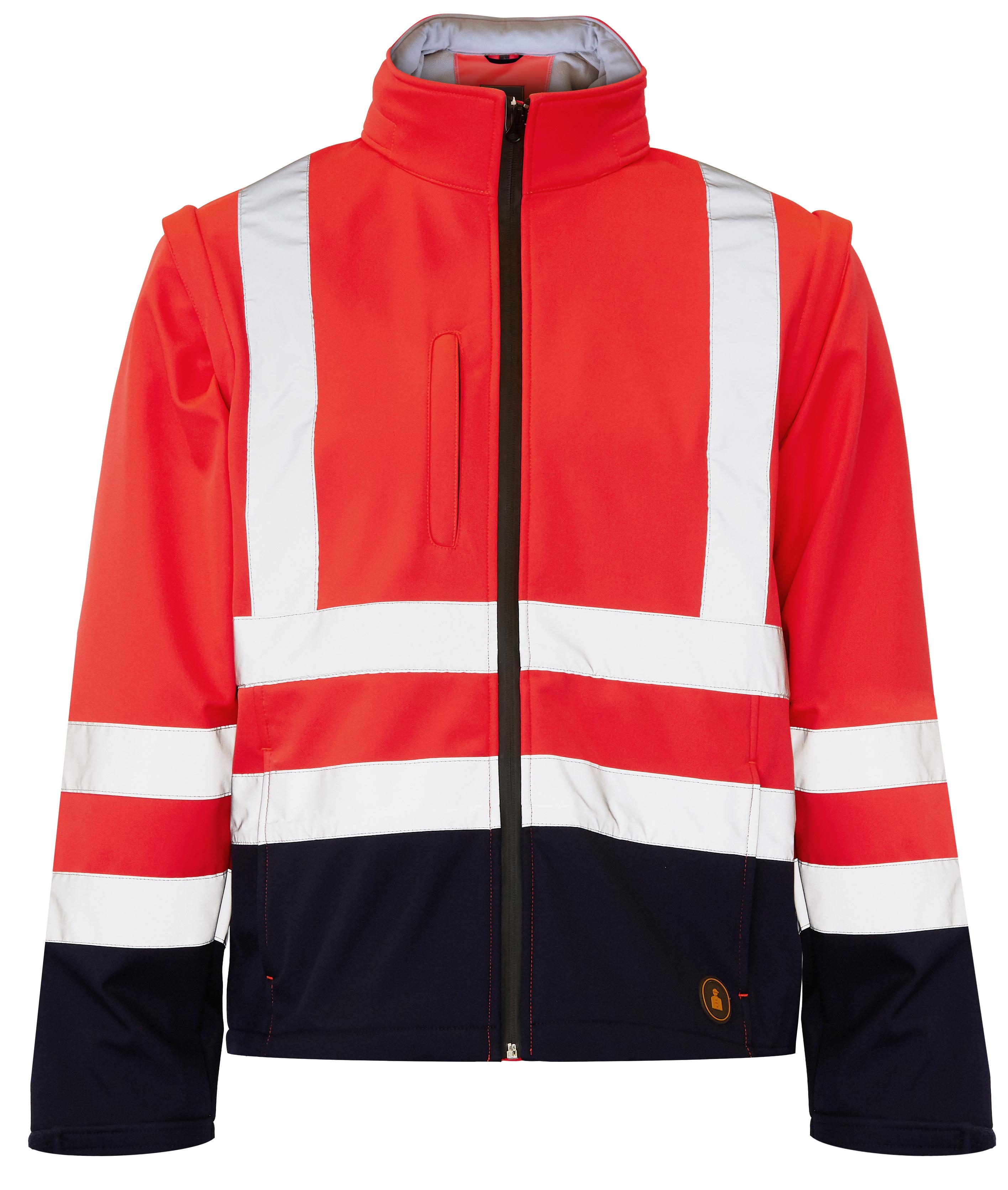 Chaqueta softshell bicolor clase II mangas desmontables, cremallera central, 1 bolsillo cremallera en pecho, 2 bolsillos inferiores cortados con cremallera, puño regulable con velcro, cintura con cordón ajustable, cuello con capucha. 2 bandas reflectantes en torso y mangas.